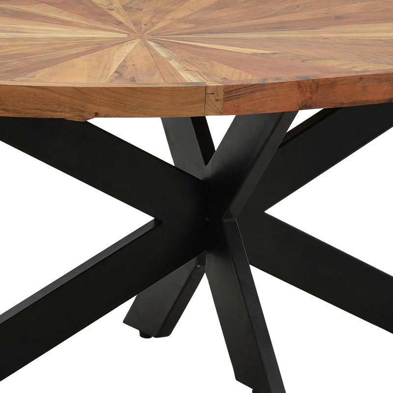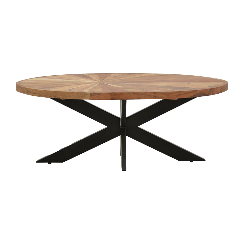 • Μοναδικός Σχεδιασμός: Η οβάλ επιφάνεια από μασίφ ξύλο, με το εντυπωσιακό ακτινωτό μοτίβο, προσδίδει μια αίσθηση ζεστασιάς και εκλεπτυσμένης ρουστίκ κομψότητας. Κάθε τραπέζι είναι μοναδικό, με τους φυσικούς κόκκους του ξύλου να αφηγούνται τη δική τους ιστορία.