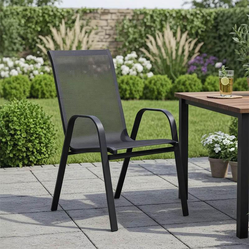 Σταθερός σκελετός από μέταλλο με αντοχή στην καταπόνηση και στη φθορά. Κυρίως σώμα καρέκλας από εξαιρετικής ποιότητας textilene. Το textilene είναι ύφασμα μεγάλης αντοχής στην ηλιακή ακτινοβολία και την υγρασία ενώ παράλληλα αφήνει το δέρμα να “αναπνέει” δημιουργώντας έτσι άνεση στο κάθισμα.