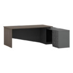 Γραφείο διεύθυνσης με ενσωματωμένο γωνιακό ερμάριο (στη δεξιά πλευρά), στον εντυπωσιακό χρωματισμό του καρυδί – ανθρακί. Κατασκευασμένο από υλικά υψηλών προδιαγραφών και σύμφωνα με τις εργονομικές απαιτήσεις του σήμερα.