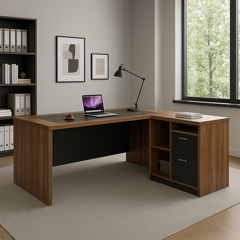 Γραφείο διεύθυνσης αναστρέψιμο (τοποθετείτε σε όποια πλευρά θέλετε), στον εντυπωσιακό χρωματισμό του καρυδί – ανθρακί. Κατασκευασμένο από υλικά υψηλών προδιαγραφών και σύμφωνα με τις εργονομικές απαιτήσεις του σήμερα.