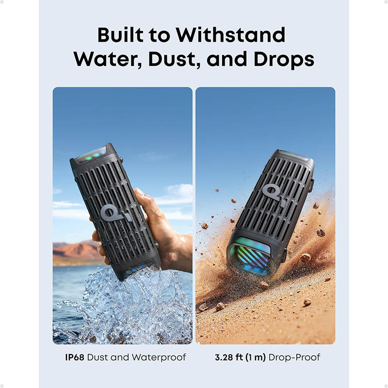 Το ηχείο διαθέτει αδιάβροχη πιστοποίηση IP68, που σημαίνει ότι είναι προστατευμένο από τη σκόνη και μπορεί να αντέξει την επαφή με το νερό. Αυτό το καθιστά ιδανικό για χρήση στην παραλία ή δίπλα στην πισίνα, όπου οι πιθανότητες να βραχεί είναι αυξημένες.