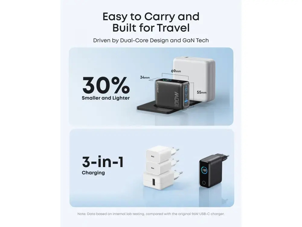 Παρά την τεράστια ισχύ του, αυτός ο φορτιστής είναι 30% μικρότερος και ελαφρύτερος από τους συμβατικούς φορτιστές 100W. Ο σχεδιασμός με τις αναδιπλούμενες ακίδες (foldable plug) και το βάρος των μόλις 211 g τον καθιστούν ιδανικό για καθημερινή μεταφορά στην τσάντα ή ακόμα και στην τσέπη σας. Είναι η απόλυτη επιλογή για ταξιδιώτες και επαγγελματίες που θέλουν να ελαφρύνουν το φορτίο τους χωρίς να θυσιάσουν την ταχύτητα φόρτισης.