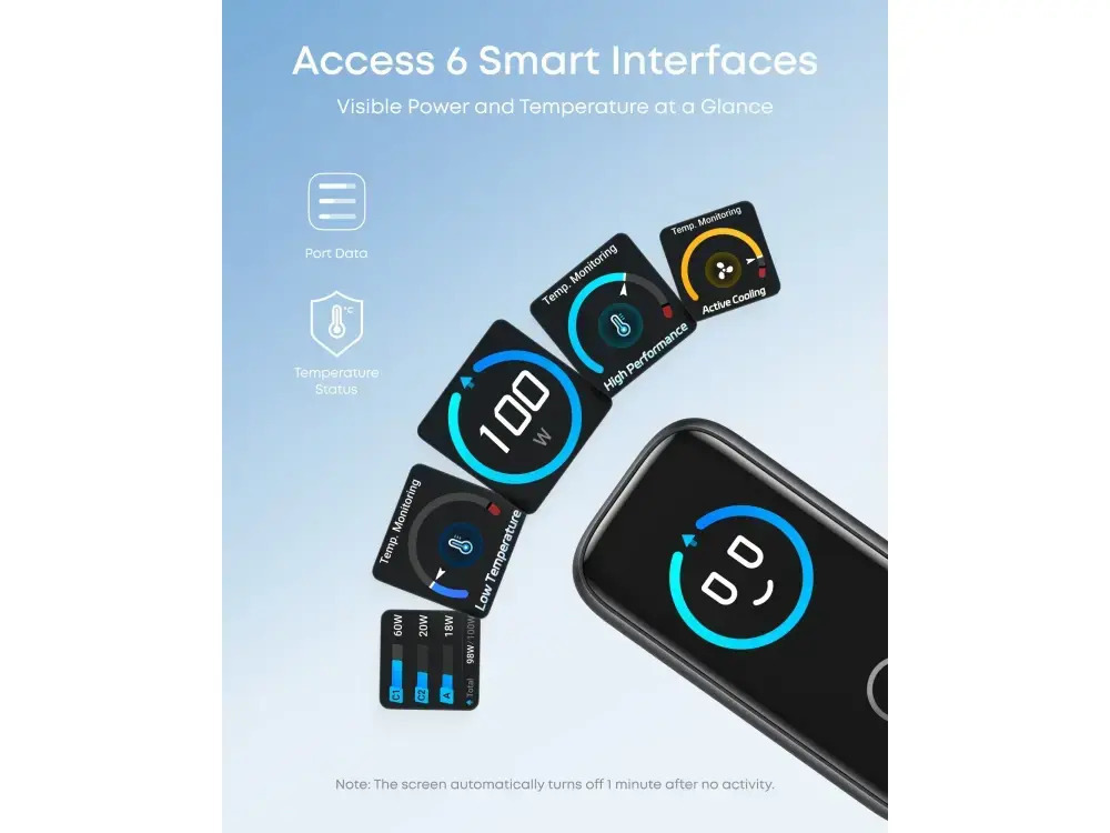 Καινοτομήστε στον τρόπο που φορτίζετε με τη δυναμική Smart Display. Η οθόνη εμφανίζει ζωντανές ενδείξεις για την ισχύ (Watt), την τάση και τη θερμοκρασία με εντυπωσιακά γραφικά. Μπορείτε να δείτε ακριβώς πόση ενέργεια καταναλώνει η συσκευή σας, ενώ η δυνατότητα περιστροφής της οθόνης κατά 90° ή 180° εξασφαλίζει ότι οι πληροφορίες θα είναι πάντα ορατές, ανεξάρτητα από τον τρόπο που έχετε τοποθετήσει τον φορτιστή στην πρίζα.
