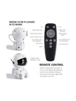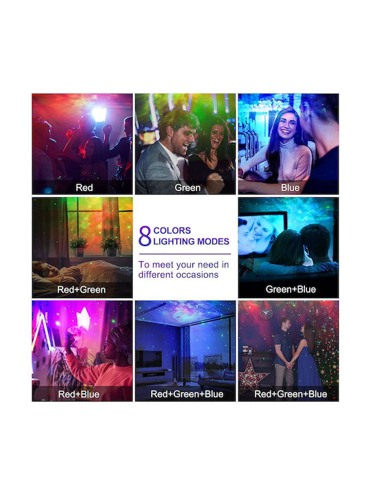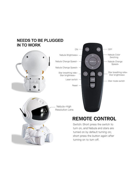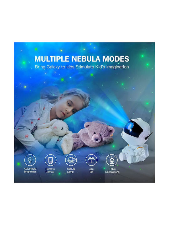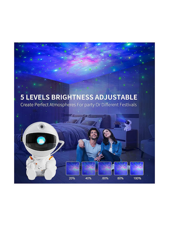 Προβολέας Star Galaxy με επτά εφέ αλλαγής γαλαξιών, καθώς και πολλά πράσινα αστέρια που αναβοσβήνουν. Η ταχύτητα είναι ρυθμιζόμενη και τα χρώματα είναι πλούσια και ποικίλα. Το κεφάλι του αστροναύτη μπορεί να περιστραφεί 360 μοίρες για να προσαρμόσετε τη γωνία προβολής που σας αρέσει, χαρίζοντας σας μια πλούσια οπτική εμπειρία. Αυτός ο προβολέας φωτός, συνοδεύεται από τηλεχειριστήριο, το οποίο μπορεί να ανάψει/σβήσει το βόρειο σέλας και τον έναστρο ουρανό, να ρυθμίσει τη φωτεινότητα, να αλλάξει τη λειτουργία φωτισμού και η λειτουργία είναι απλή και κατανοητή. Ως φωτιστικά δωματίου για την κρεβατοκάμαρα, μπορείτε να προσαρμόσετε το εφέ προβολής σύμφωνα με τις προτιμήσεις σας και μπορείτε να το απενεργοποιήσετε όταν θέλετε να κοιμηθείτε χωρίς να σηκωθείτε.